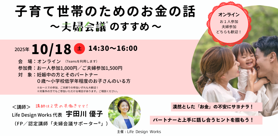 本セミナーでは、教育費に関する最新情報や家計管理の方法など、知っておいて損のないお金の知識をワークを交えて解説。お金の『夫婦会議®』を始めるキッカケをお届けします。