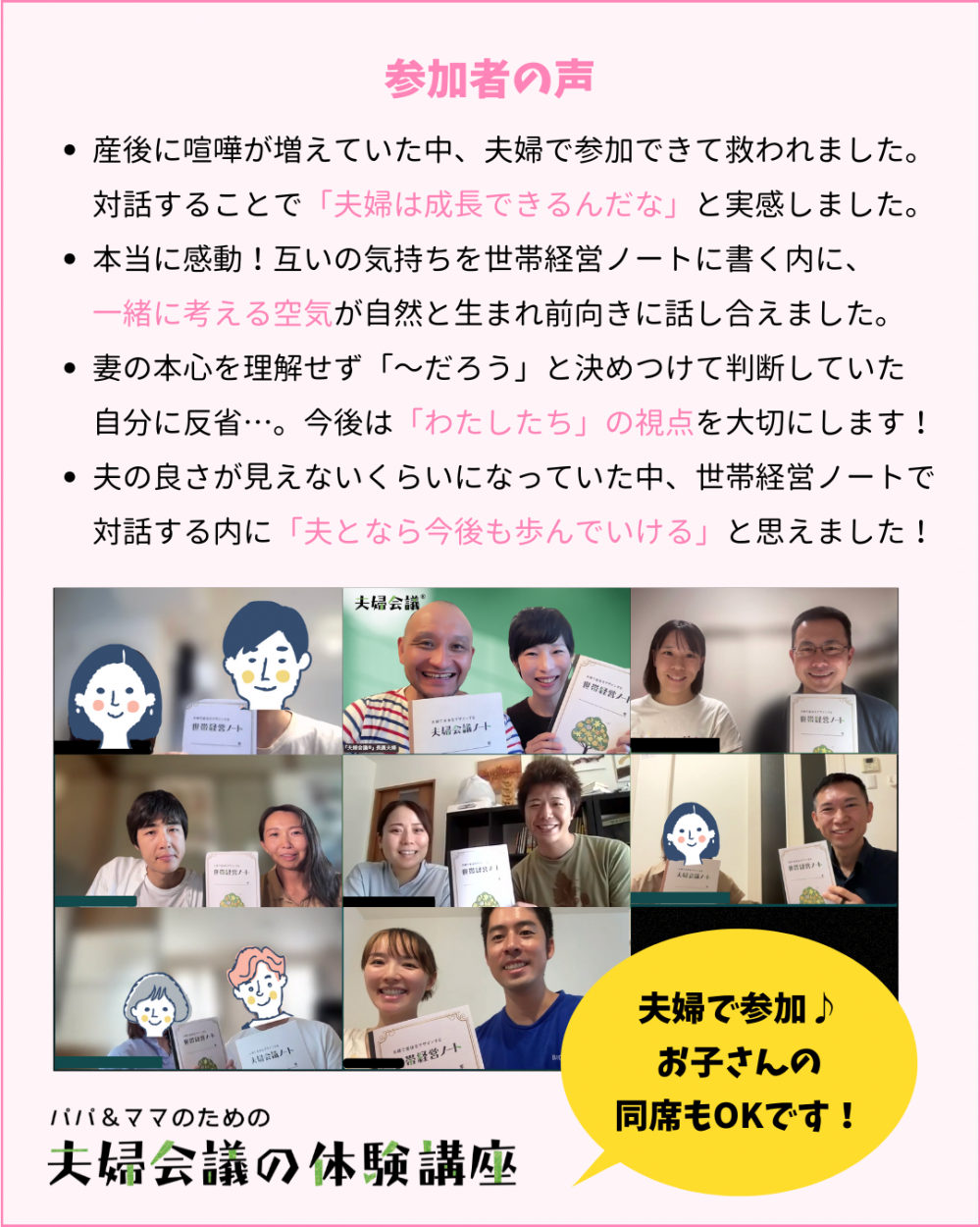ご参加いただく皆様のより良い夫婦の対話とパートナーシップづくり、家庭内のより良い子育て環境づくりに貢献できれば幸いです!画面越しにはなりますが、皆様とのご縁を楽しみにしています!当日は宜しくお願い致します!
