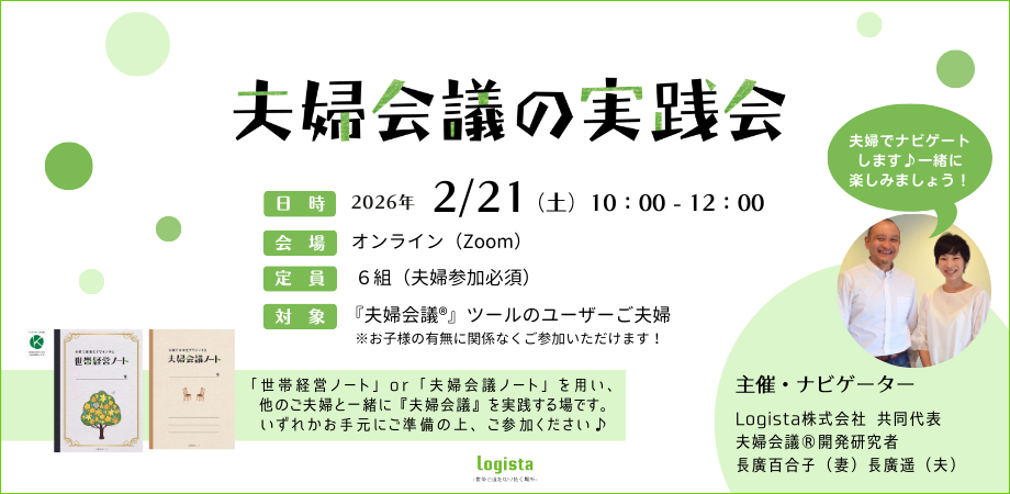 ※こちらの「夫婦会議の実践会」は、『夫婦会議®︎』の開発元のLogista株式会社の代表・長廣夫婦が主催・ナビゲート致します。他に認定講師「夫婦会議サポーター®︎」が主催・ナビゲートする会もございます。日時やナビゲーターの特徴などを参考に、お好きな会にご参加ください♪