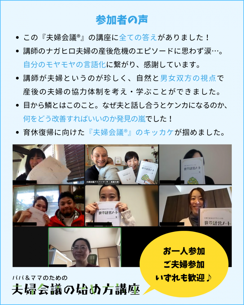 ご参加いただく皆様のより良い夫婦の対話とパートナーシップづくり、家庭内のより良い子育て環境づくりに貢献できれば幸いです!画面越しにはなりますが、皆様とのご縁を楽しみにしています!当日は宜しくお願い致します!