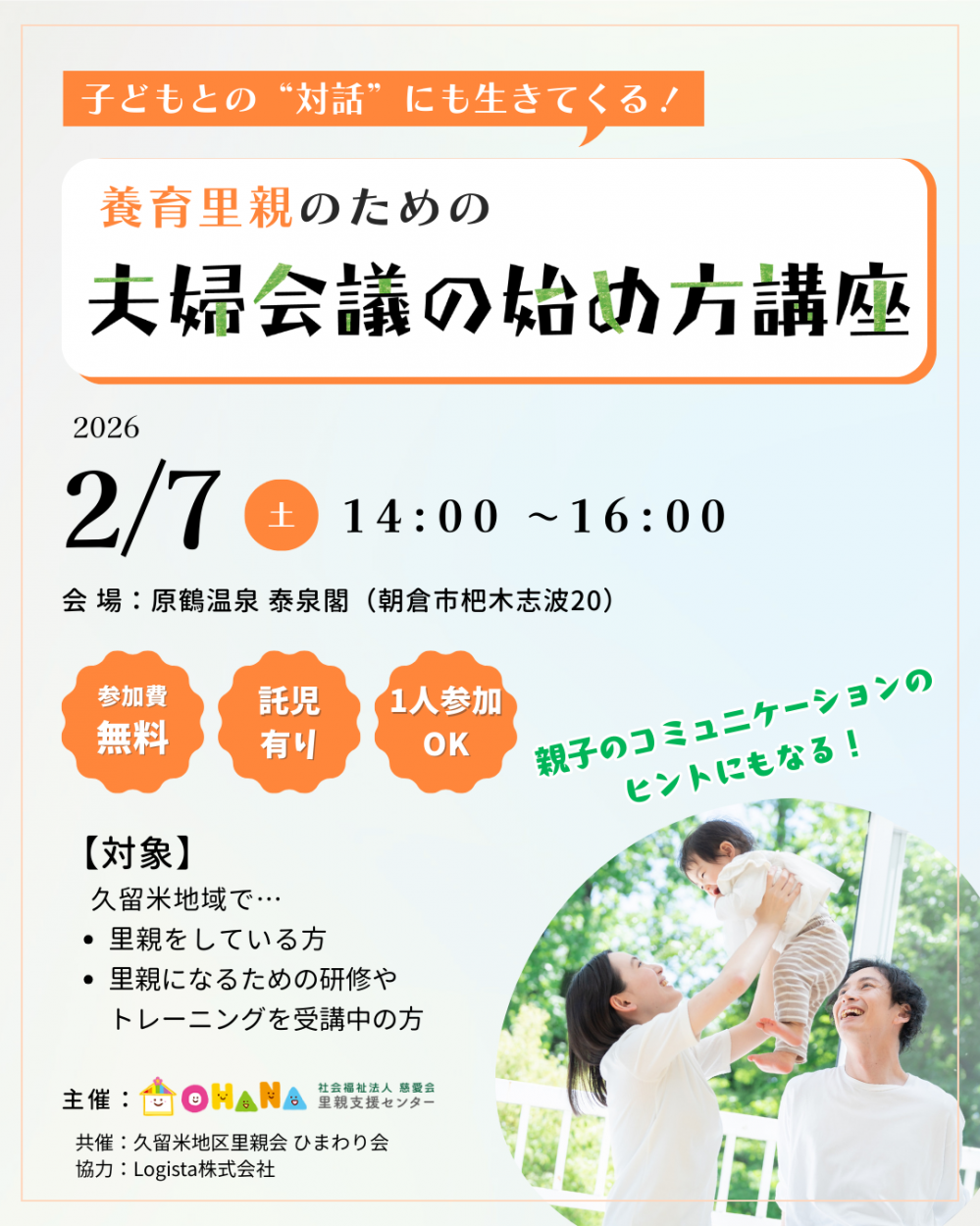 2026年2月7日(土)はOHANA様主催で、養育里親のための「夫婦会議の始め方講座」を開催。